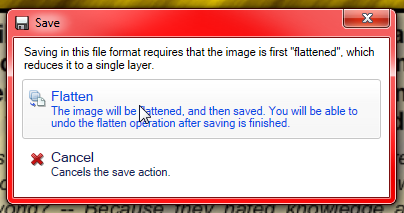 -When saving as a JPG or PNG it will ask you to flatten the image (because you can't have layers with JPGs and PNGs). Go ahead and do so.