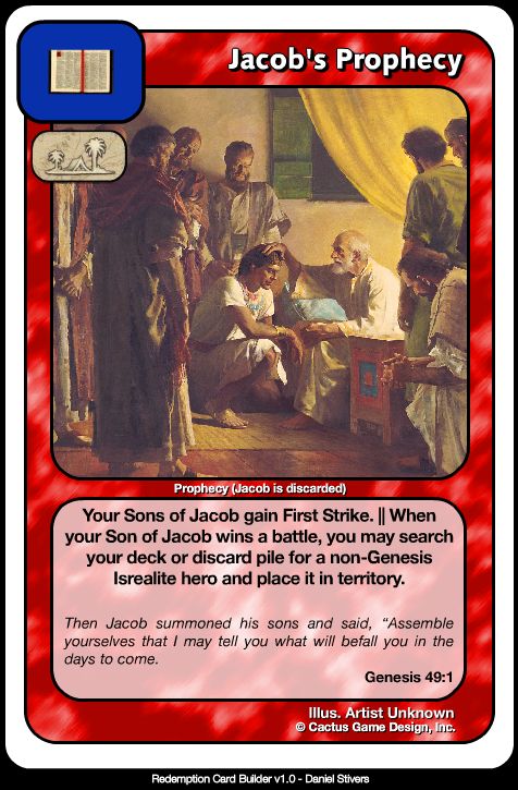 Now, a lot of the OT prophecies are about Jesus. In fact, one of my concerns about this are actually that playing SoG will, with enough of these types of cards, set off a ridiculous chain of ubercharged abilities. One way to avoid this is to focus on other parts of Jesus' ministry (for example, Isaiah 35:5 "Then the eyes of the blind will be opened and the ears of the deaf will be unstopped." could have a condition related to blindness being removed, or an enhancement about Jesus healing blind/deafness). Still, there are other prophecies that don't involve Christ. For example, we could go to Jacob's prophecy concerning his sons: