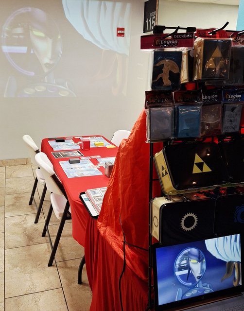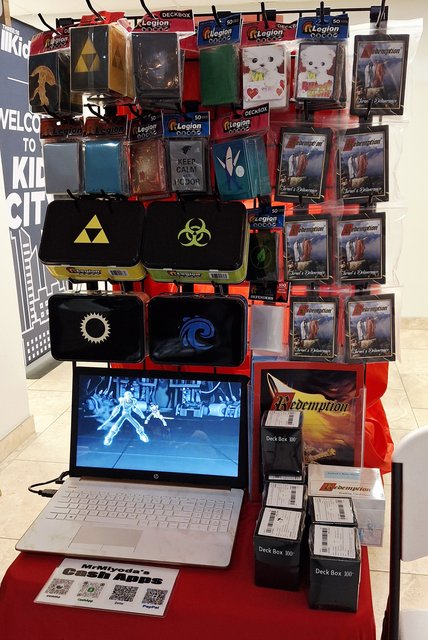 Demo team member Nick showing off his sleeved complete Redemption decks he himself assembled to play w his dad.