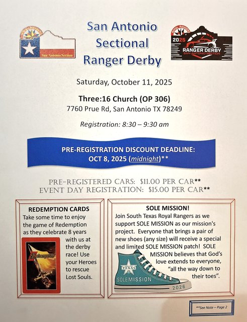 Prepping for my 8th San Antonio Rpyal Rangers Sectional Pinewood Derby at a church called Three:16. Almost all.day event on Saturday 11Oct2025