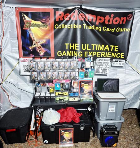 Redemption display at PowWow2026. Pray for my throat to withstand the onslaught of needing to teach d game to new RR players. Thank God I have at least a couple of my demo team members to help me tonight. There will be more helpers tmw. Playing on my laptop wud be some Redemption vids as well as all 4 Angel Wars movie episodes. This year we concentrate on promoting purely starter deks.