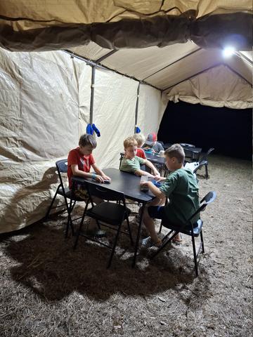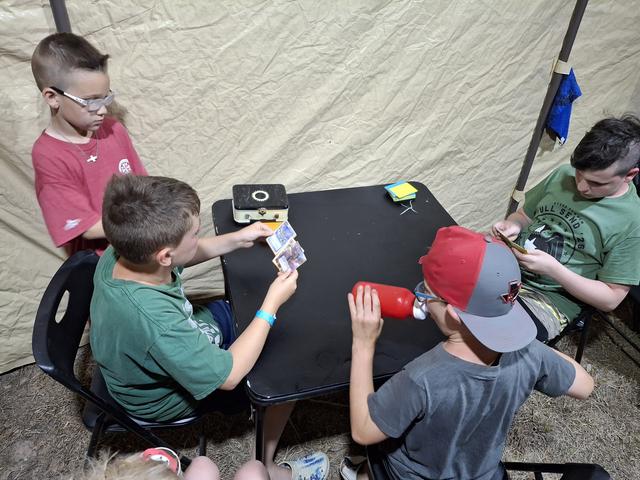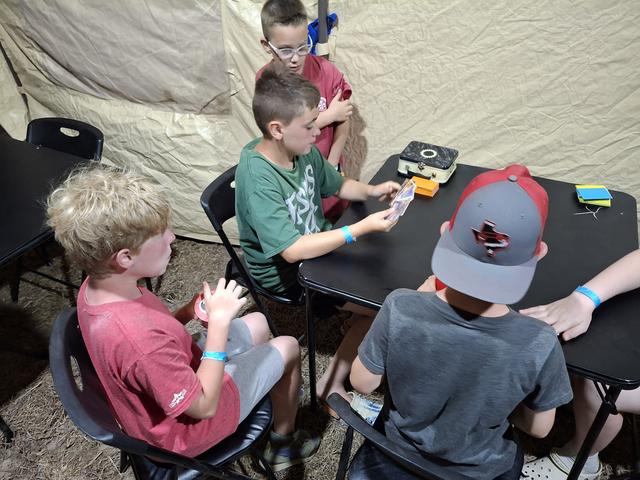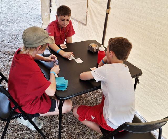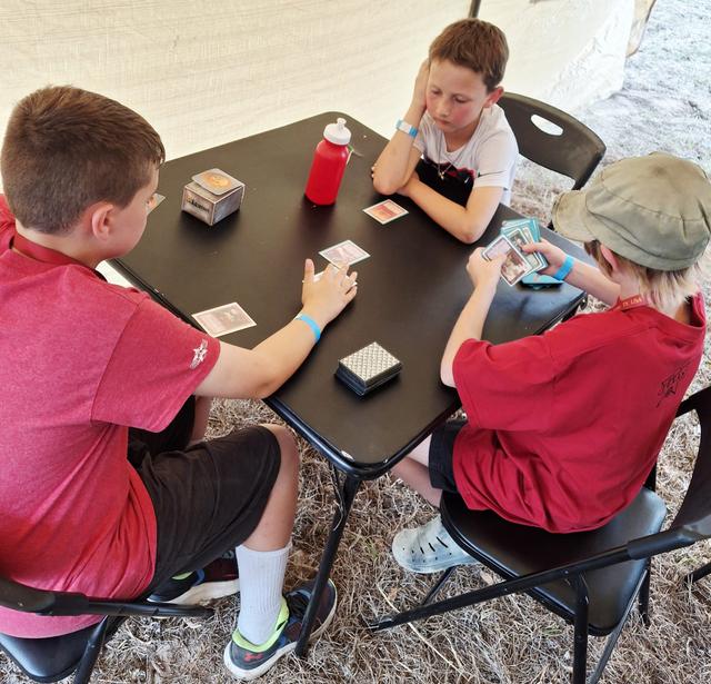 Nick (10), new RR Redemption demo team member, teaching a camper. His brother looks at the camera w a big smile like last year. This younger brother Noah (6) had to correct his older brother about drawing 3 cards per turn and not 1, lol. It's a fun and painful learning process mastering this game... y'all know...